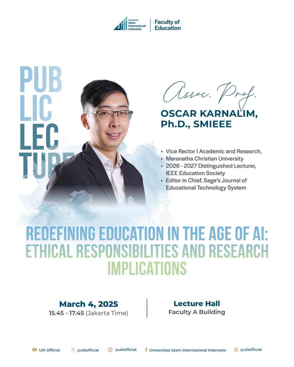 The Faculty of Education invites you to attend a Public Lecture on “Redefining Education in the Age of AI: Ethical Responsibilities and Research Implications” with A/Prof. Oscar Karnalim, S.T., M.T., Ph.D., SMIEEE.