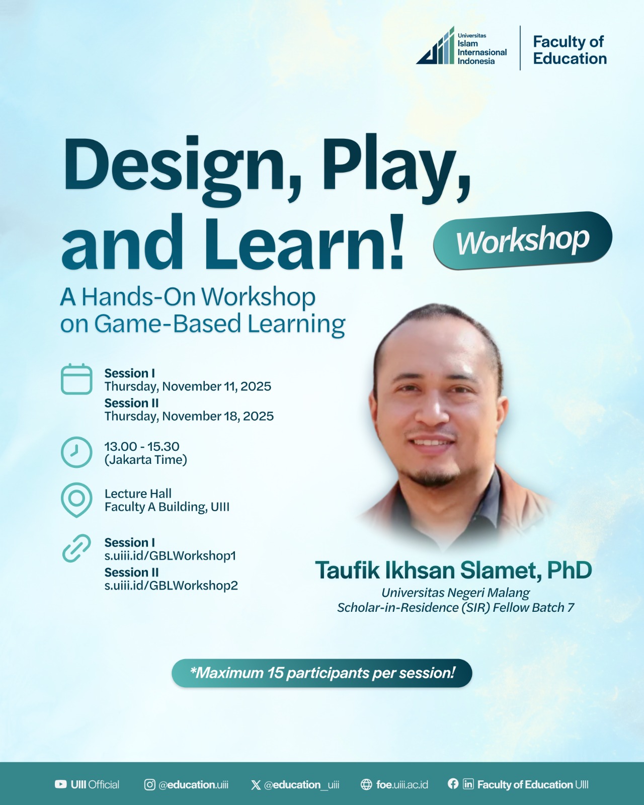 We would like to inform you that the Faculty of Education, UIII, will conduct a workshop with the tittle: “Design, Play, and Learn! A Hands-On Workshop on Game-Based Learning” with Taufik Ikhsan Slamet, PhD.